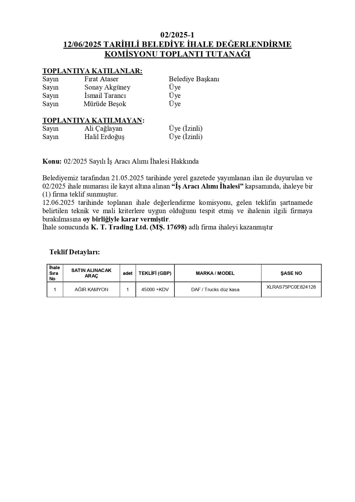 İŞ ARACI ALIM İHALESİ SONUÇLANDI 13 Haziran 2025, 09:07