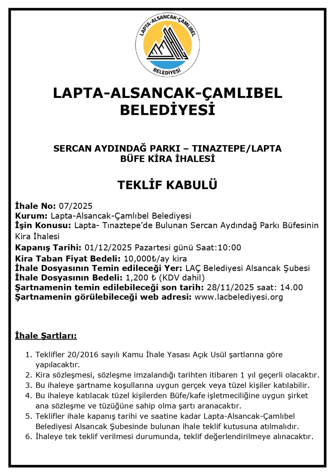 - Teklifler ihale kapanış tarihi ve saatine kadar Lapta-Alsancak-Çamlıbel Belediyesi Alsancak Şubesinde bulunan ihale teklif kutusuna atılmalıdır.